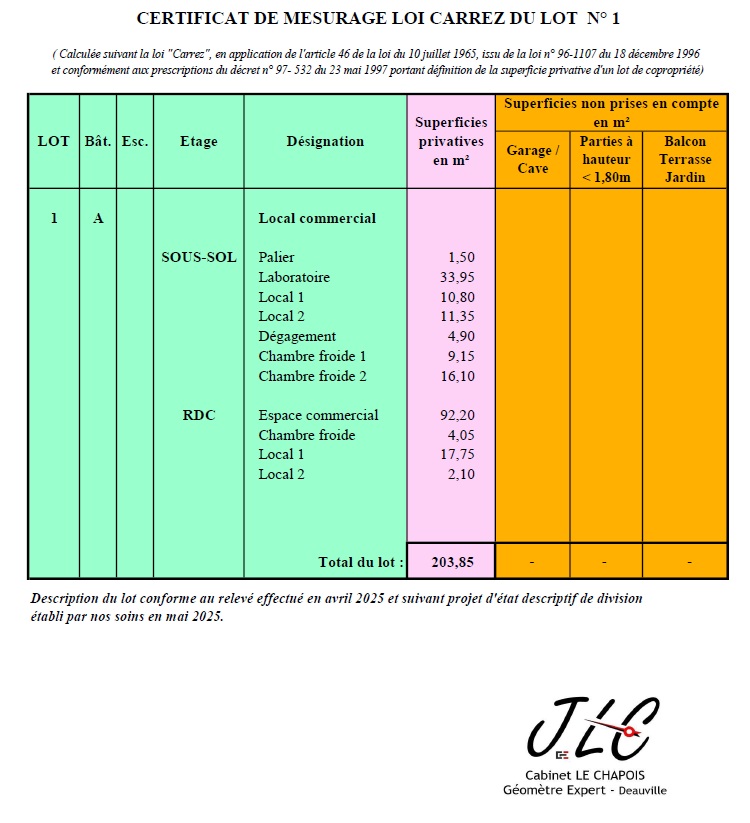 Le cabinet intervient pour mesurer proprement le lot concerné et remettre un document clair, utile au propriétaire, au notaire, à l'agent ou à l'acquéreur dans le cadre de la vente.